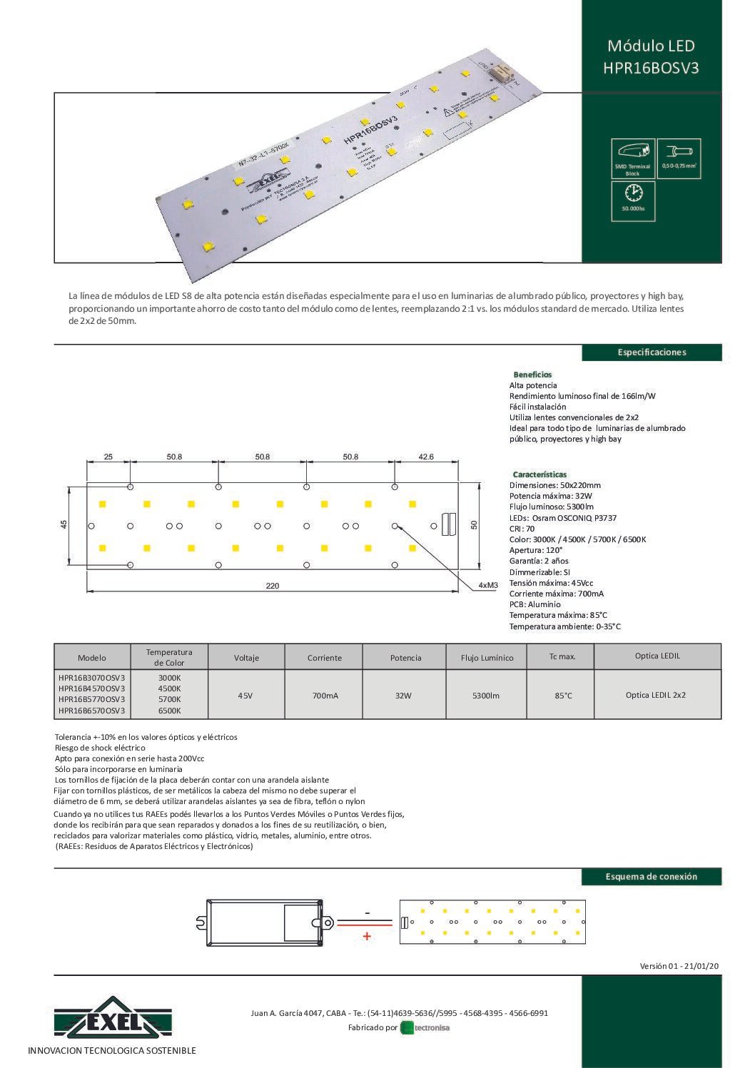 Temperatura: 3000K / 4500K / 5700K / 6500K Tensión máxima: 45Vcc Corriente máxima: 700mA Potencia máxima: 32W PCB: Aluminio Flujo luminoso: 5300lm