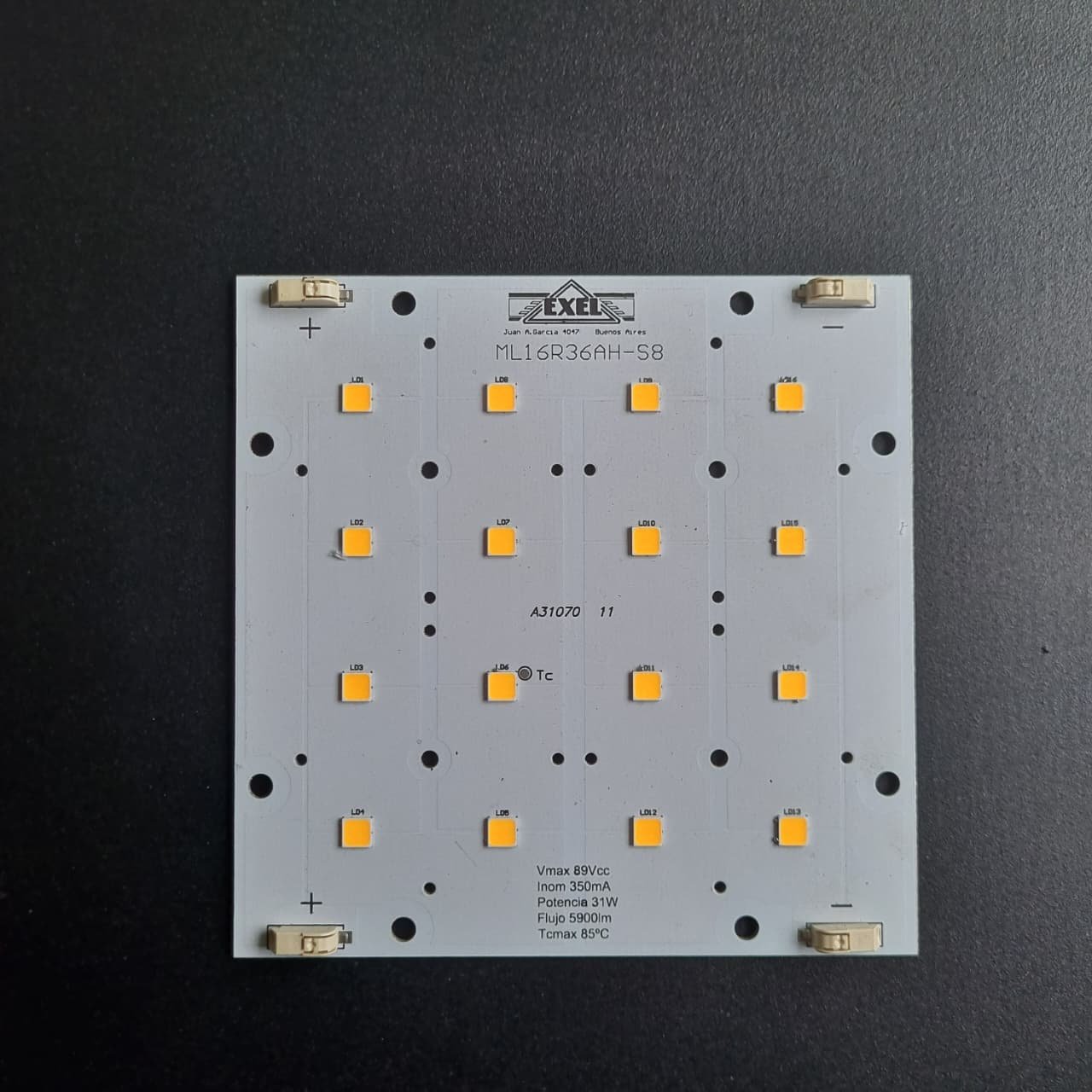Temperatura: 2200K / 3000K / 4000K / 5000K Tensión máxima: 89Vcc Corriente máxima: 350mA Potencia máxima: 31W PCB: Aluminio Flujo luminoso: 5900lm