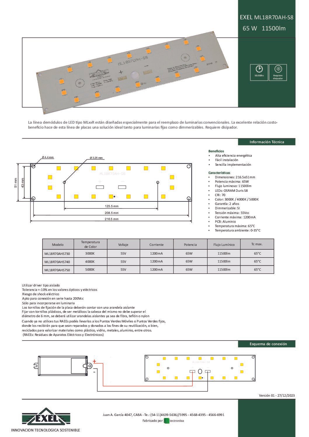 Temperatura: 3000K / 4000K / 5000K Tensión máxima: 55Vcc Corriente máxima: 1200mA Potencia máxima: 65W PCB: Aluminio Flujo luminoso: 11500lm