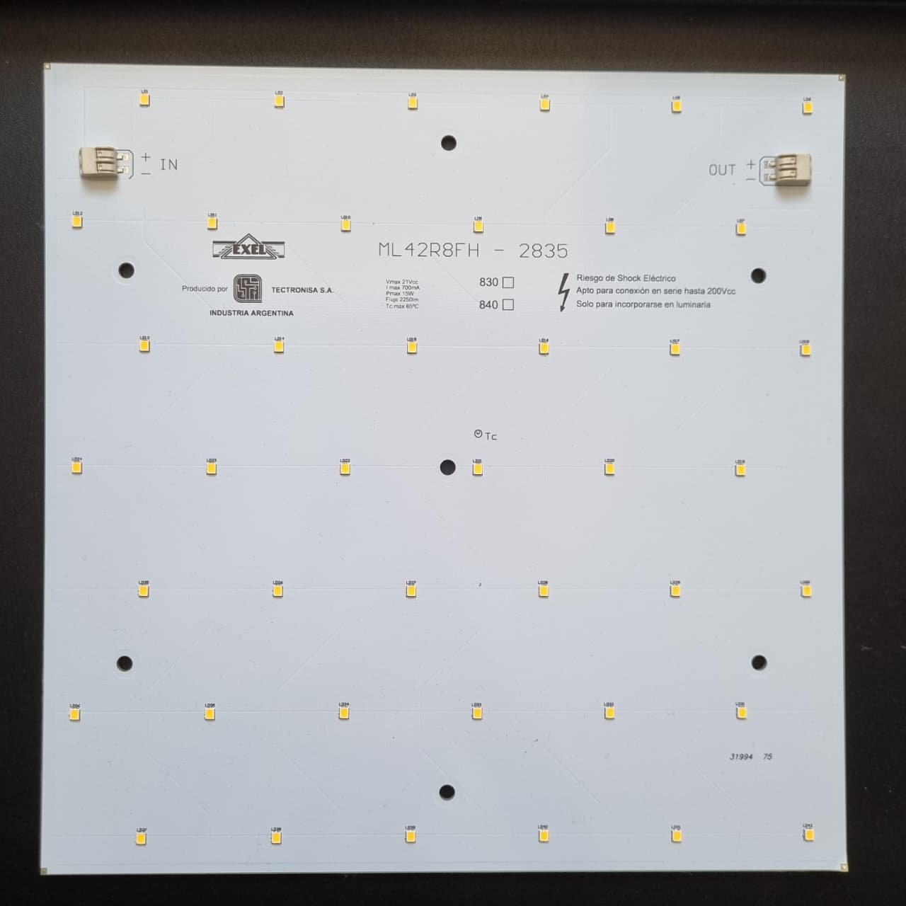 Temperatura: 3000K / 4000K Tensión máxima: 21Vcc Corriente máxima: 700mA PCB: FR4 Flujo luminoso: 2250lm