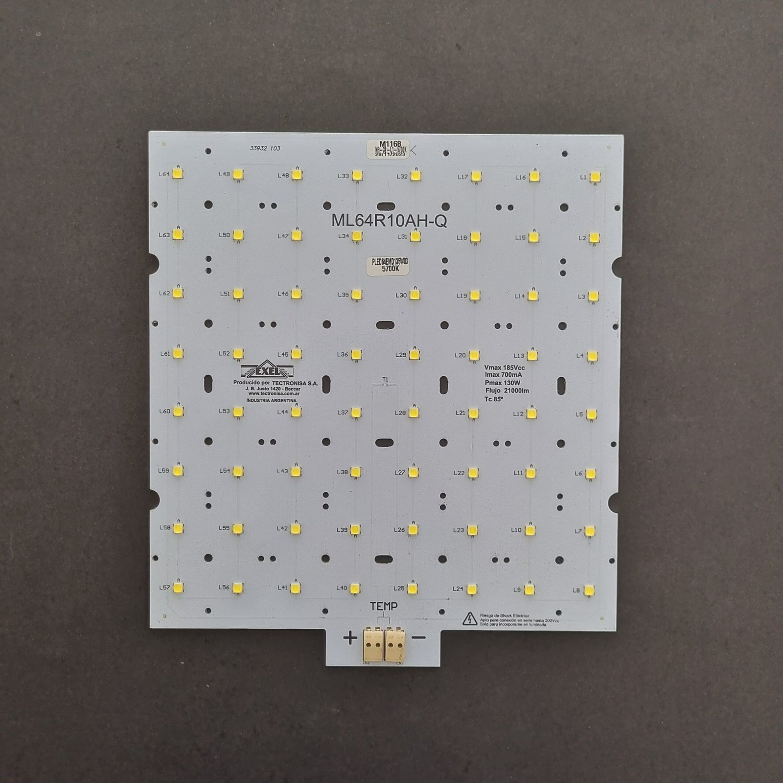 Temperatura: 3000K / 4500K / 5700K / 6500K Tensión máxima: 186Vcc Corriente máxima: 700mA Potencia máxima: 130W PCB: Aluminio Flujo luminoso: 22000lm