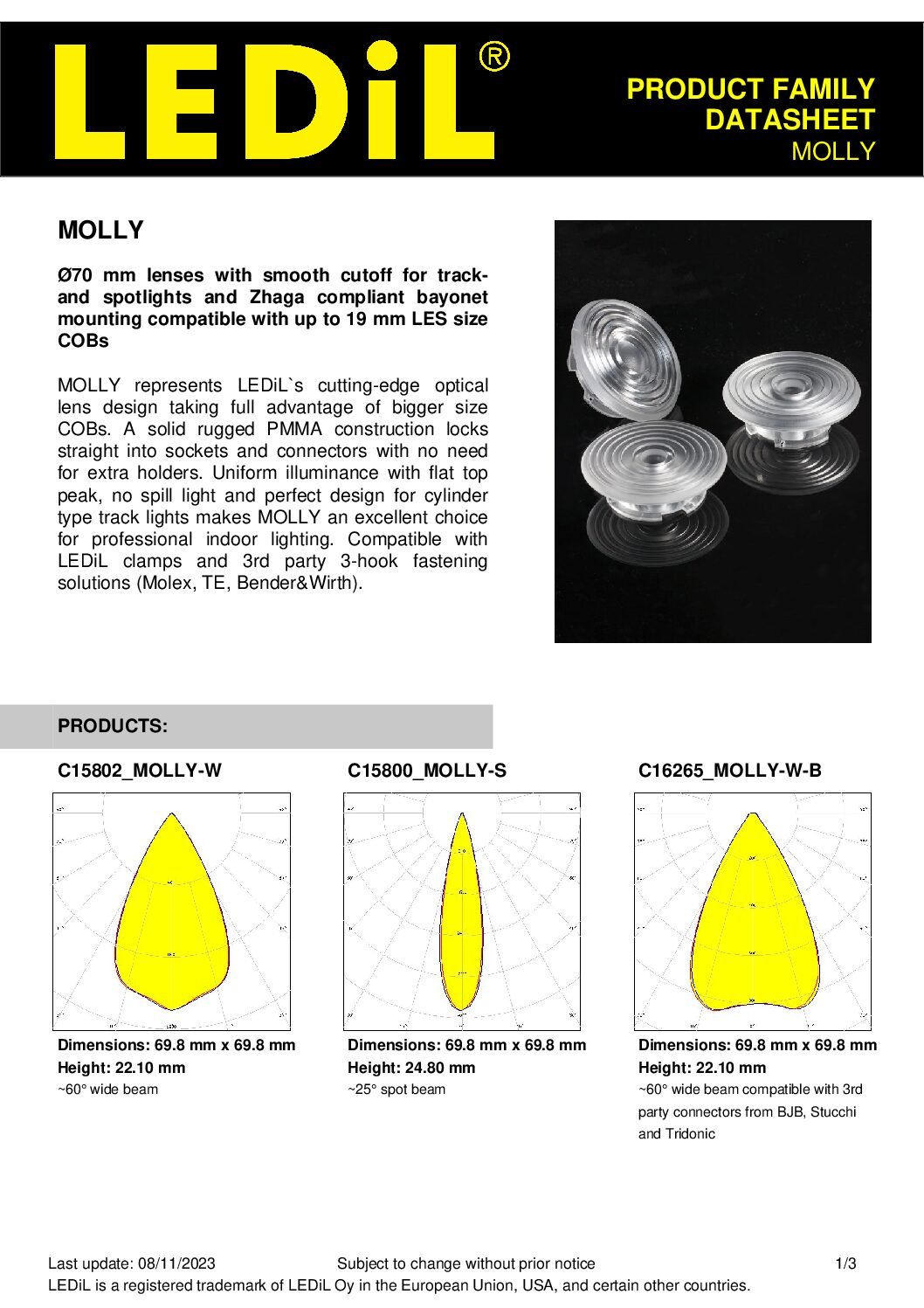 Lentes de Ø70 mm con corte suave para carriles y focos, y montaje de bayoneta compatible con Zhaga. Compatible con COB de tamaño LES de hasta 19 mm.